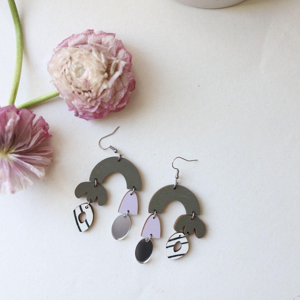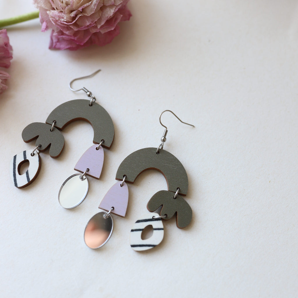Korupajan palat uudistuvat, vanhoista paloista tehty poistokorvakoruja. Vaneri kotimaista koivuvaneria, koruosat kirurginterästä.