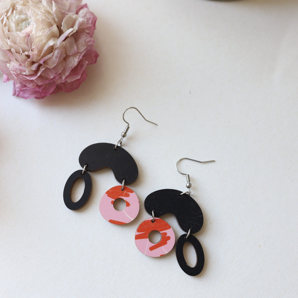 Korupajan palat uudistuvat, vanhoista paloista tehty poistokorvakoruja. Vaneri kotimaista koivuvaneria, koruosat kirurginterästä.
