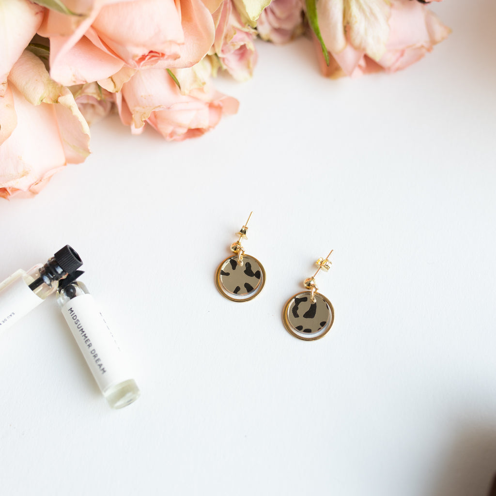 Lein korvakoruissa on upea peilikulta pala jossa sisäpuolella leopardi maalaus. Palan ympärillä oleva rinkula on ruostumatonta terästä.