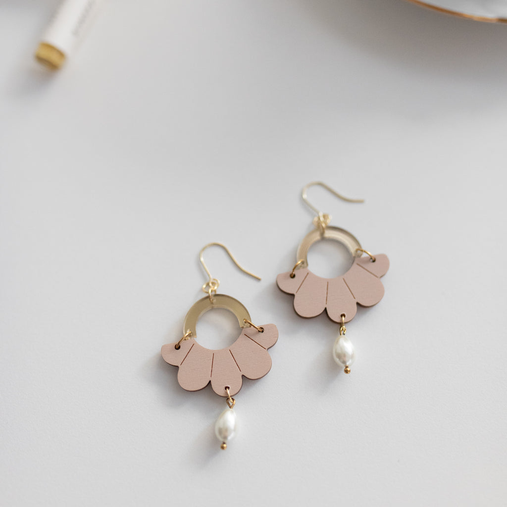 Vaaleanpunaiseen taittava beige koivuvaneria, jonka kruunaa peilikultainen kaari sekä lasihelmi.