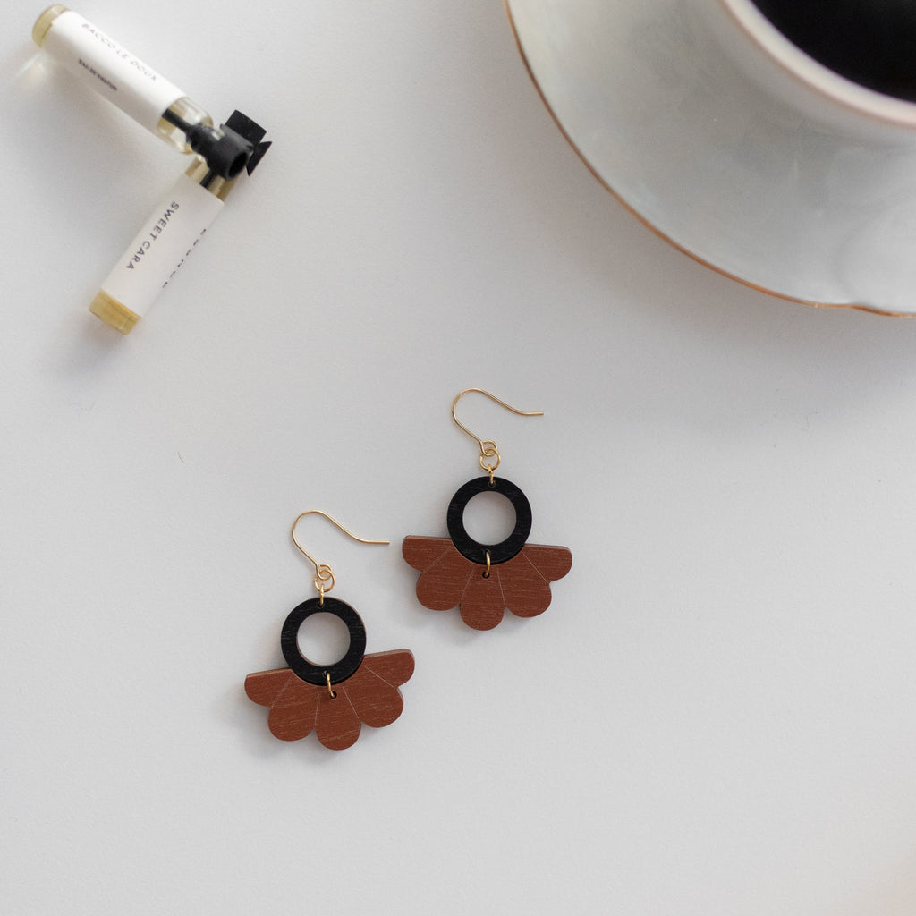 Pieni pyöreä pala on mustaa koivuvaneria. Vaihtoehtona kullatut tai teräksiset koruosat.